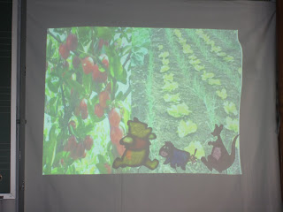 Na biblioteca foram abordadas histórias (ex: " A lagarta gulosa"; a horta do senhor lobo"; etc;) jogos e canções relacionados com a temática.